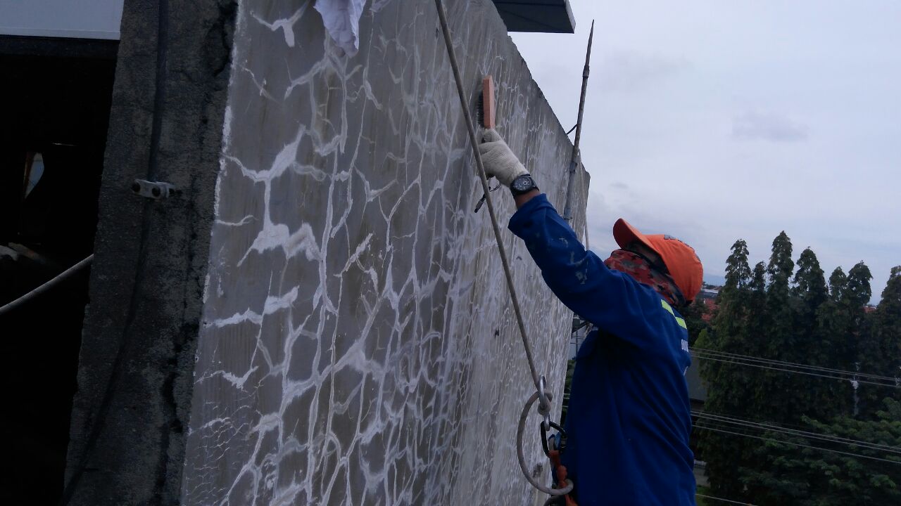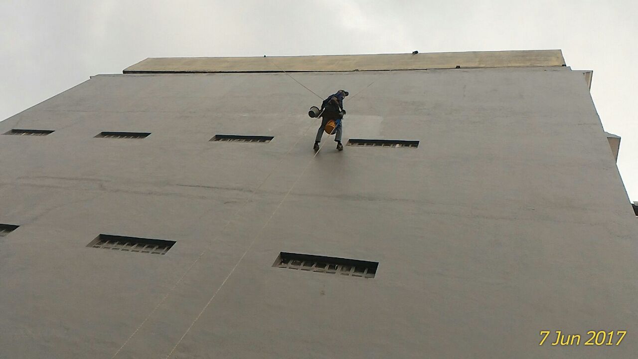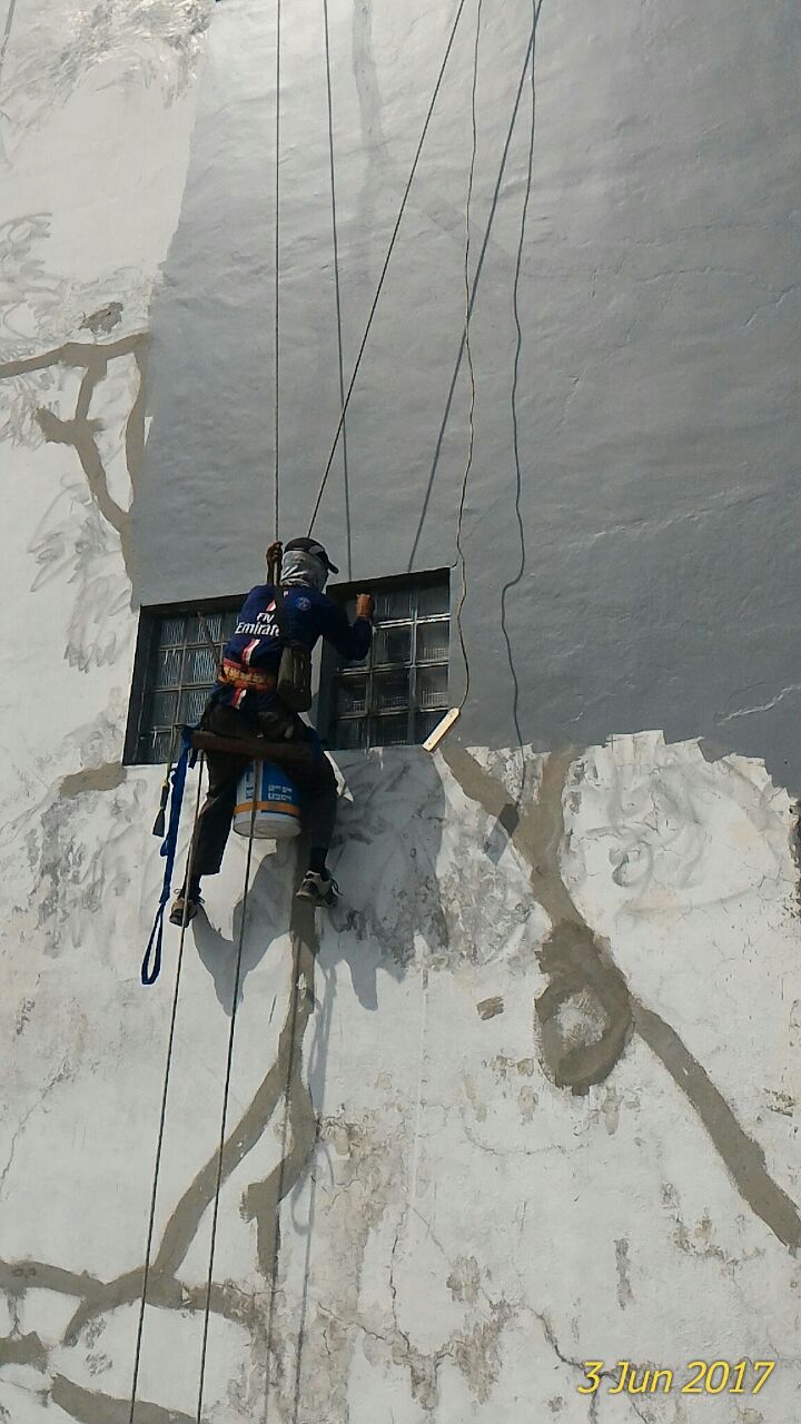 Baru – baru ini kami mendapatkan order untuk aplikasi waterproofing dinding di Bank Maybank Tegal. Yang menjadi tantangan saat ini yaitu kami tidak diperbolehkan untuk mendirikan scafolding. Untuk itu kami menggunakan cara dengan melatih aplikator kami untuk melakukan climbing. Dengan metode ini scafolding tidak diperlukan, kami hanya membutuhkan rangkaian tali khusus untuk mendaki gunung.
