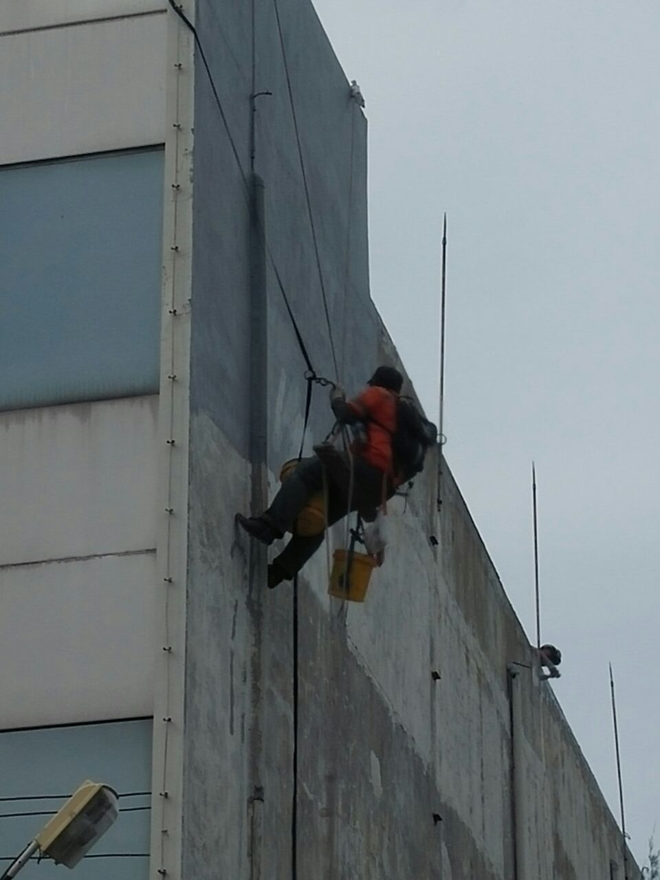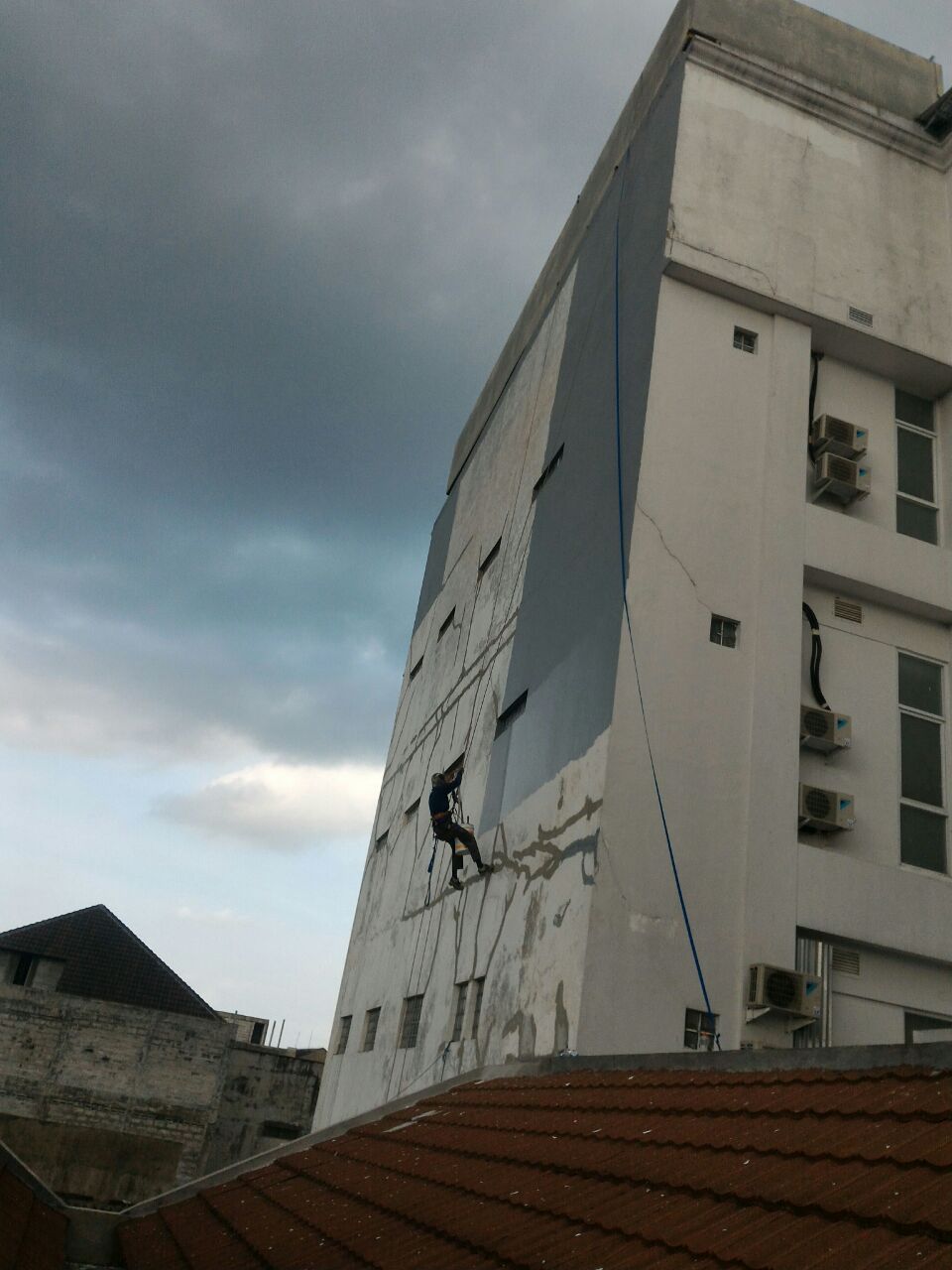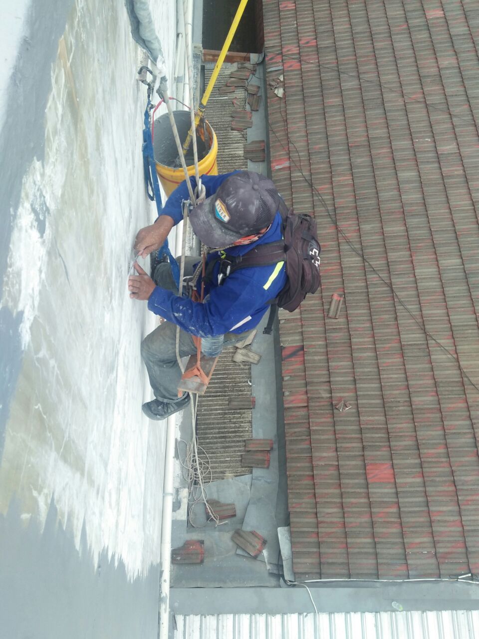 Baru – baru ini kami mendapatkan order untuk aplikasi waterproofing dinding di Bank Maybank Tegal. Yang menjadi tantangan saat ini yaitu kami tidak diperbolehkan untuk mendirikan scafolding. Untuk itu kami menggunakan cara dengan melatih aplikator kami untuk melakukan climbing. Dengan metode ini scafolding tidak diperlukan, kami hanya membutuhkan rangkaian tali khusus untuk mendaki gunung.